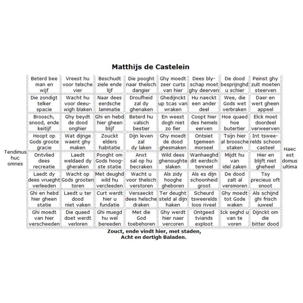 Matthijs de Castelein maakt in zijn Const van Rhetoriken, een didactisch handboek over de manier waarop poëzie geschreven moet worden, een overzicht van tal van mogelijke vormen waarin een gedicht gegoten kan worden: van de meest eenvoudige tot de meest ingewikkelde en uitzinnige structuren worden in dit boek behandeld.